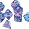 - Set of 7 sharp-edged, unsaturated polyhedral resin dice including one of each of the following dice styles: