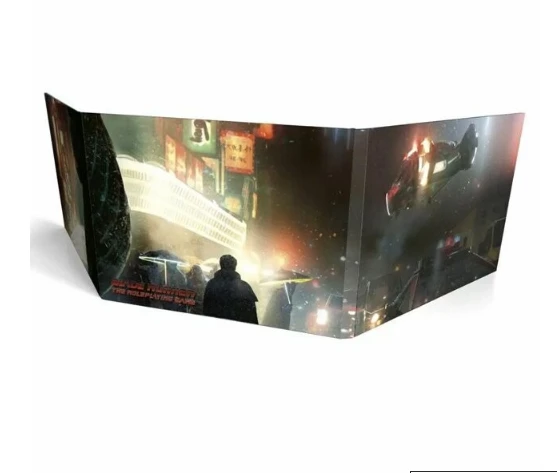 A deluxe Game Runner’s Screen in landscape format for the official BLADE RUNNER Roleplaying Game. It features Martin Grip’s art on the outside, and a host of useful tables and important information on the inside, while keeping the Game Runner’s plans hidden from the eyes of inquisitive players.