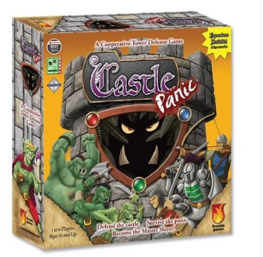 Castle Panic is a cooperative tower defence and strategy board game for 1 to 6 players. The co-op element makes Castle Panic a great family game, and the perfect kick-off for your weekly game night. Players must work together to defend their castle, in the centre of the board, from monsters that attack out of the forest at the edges of the board. Players trade cards, hit and slay monsters, and plan strategies together to keep their castle towers intact. The players either win or lose together, but only the player with the most victory points is declared the Master Slayer. Players must balance the survival of the group with their own desire to win.