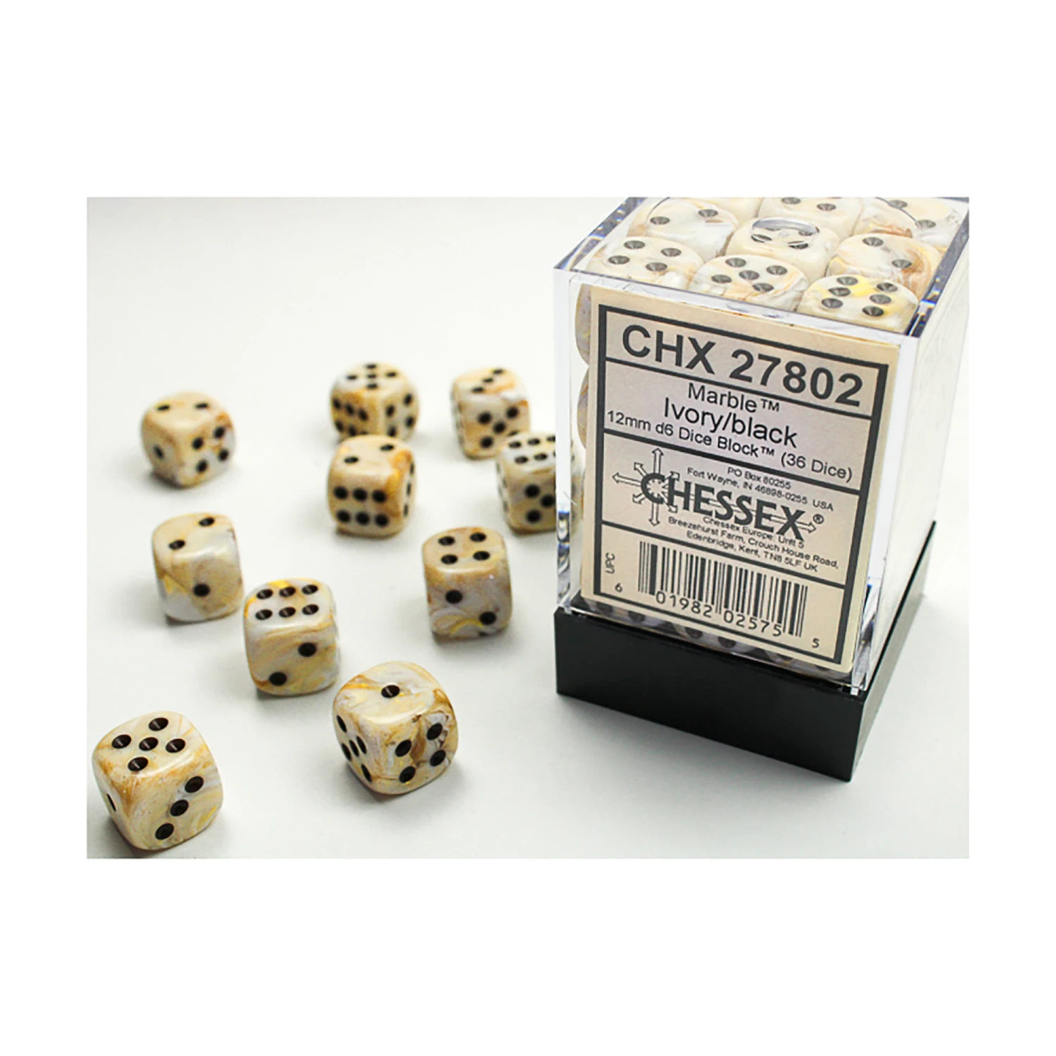 Chessex D6 Set Of 36: Marble Ivory With Black (12mm)