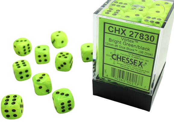 Chessex D6 Set Of 36: Vortex Bright Green With Black (12mm)
