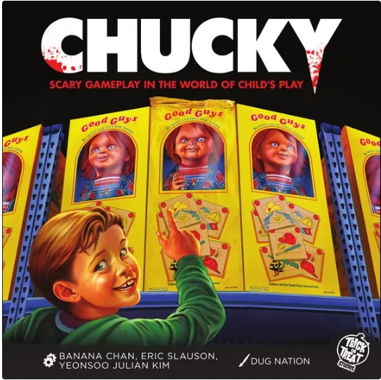 In Chucky, each player will gather evidence about the mysterious murders that have been going on. This evidence gives them skills and abilities to roll the dice and maybe handle an encounter with Chucky himself at the end of each round! After three rounds, the player who does the best at overcoming these challenges wins — because Chucky will have slaughtered everyone else.