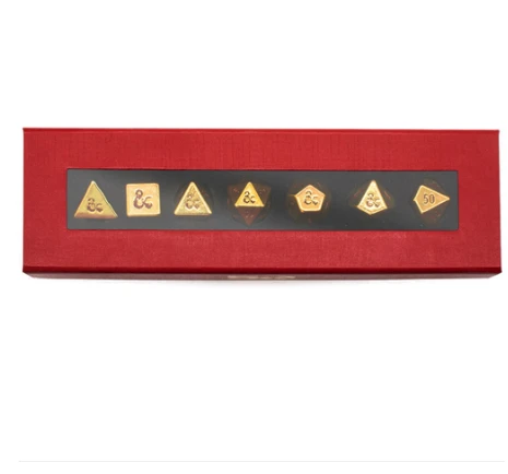 Ward off enemies on your next adventure with the commanding roll of these official golden Dungeons & Dragons 50th Anniversary Heavy Metal dice! Made from the same heavy, zinc alloy material as the Heavy Metal D20 sets, rolling these dice will send a rumble through the realm! The set includes one each: D4, D6, D8, D10, D12, D20 and a Percentile Die – all the dice you need for your next D&D adventure!