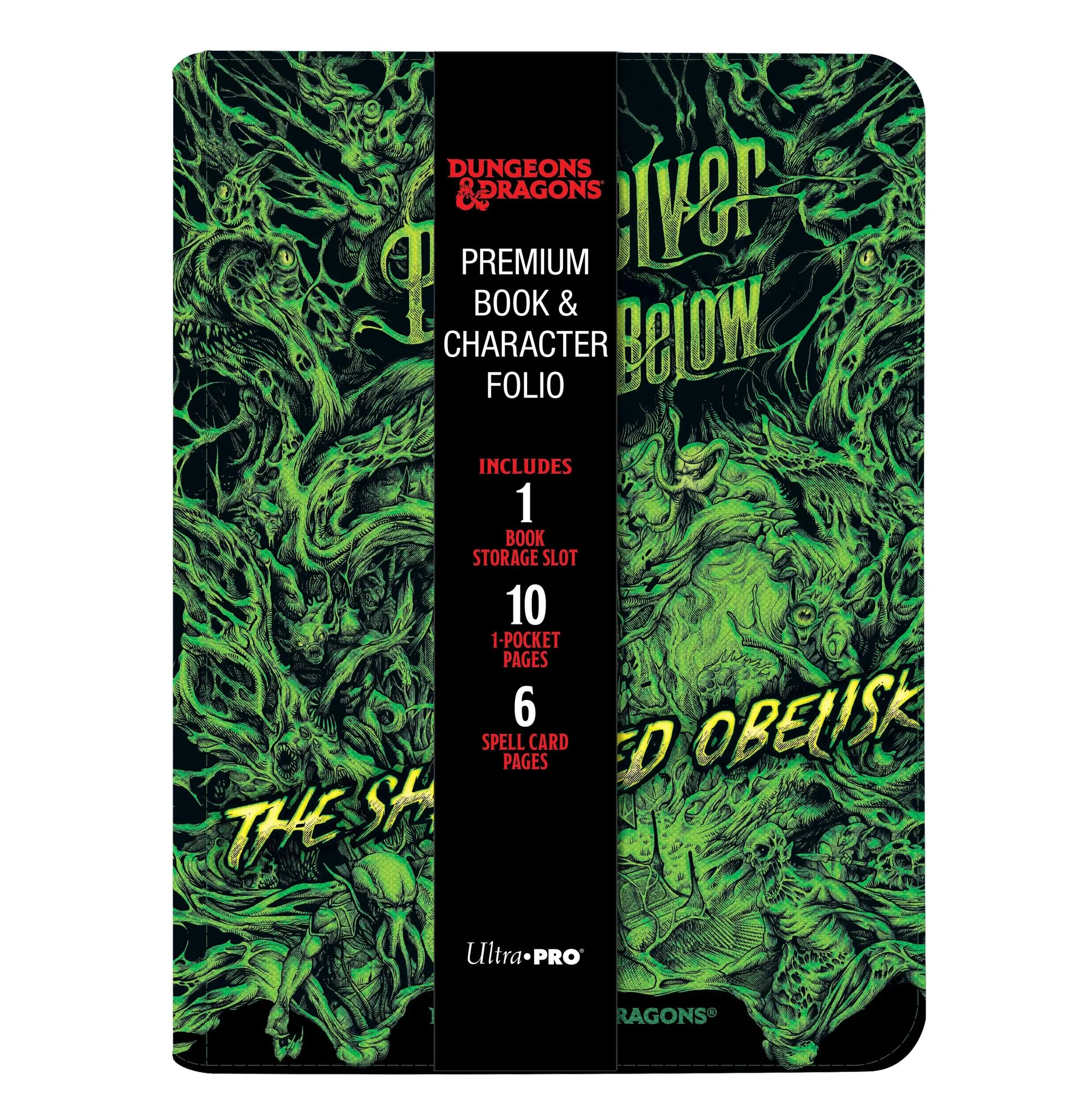 Book Folio featuring exc;usive Dungeons & Dragons artwork. This is a Premium Zippered Character Folio, designed to fit any sourcebook. Inside the premium printed leatherette cover you’ll find a pocket to store notes or maps, 10 wet/dry-erase compatible pages for character sheets and notes, six 9-pocket pages for standard size spell cards, an elastic loop to store a pencil or marker, a branded graph paper notepad, and the added pocket in the back to slide in the back cover of a sourcebook for easy access. All contents are secured by a zipper.