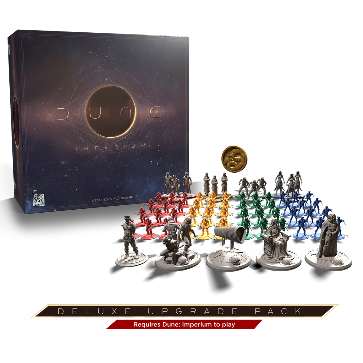 Enhance your Dune: Imperium experience with the Deluxe Upgrade Pack! This cosmetic expansion upgrades the components of the base game for a more immersive experience. The contents come in an oversized box with plastic storage trays that store the whole game (including sleeved cards).