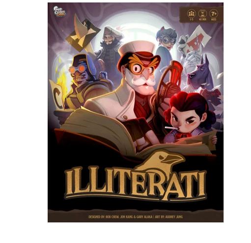 Illiterati is a real-time, co-operative word game in which players work together to form words and bind books. Each player starts the game with five letter tiles and a red torched book that shows a condition that player must achieve to restore that book, e.g. using 8+ tiles with at least 3 green symbols, create words that are all animals. A library of three random tiles is placed in the centre of the table. The game takes place in three-minute rounds, and before the round begins each player draws seven letter tiles from the draw bag.